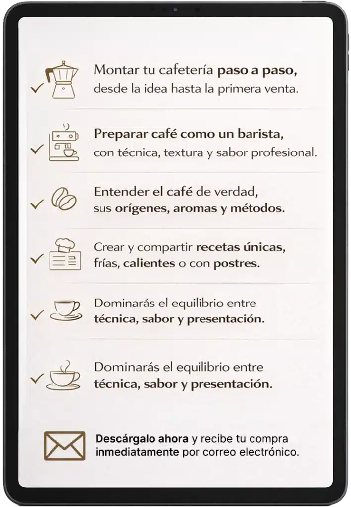 Antes de comprar dudé porque pensé que sería solo una lista de recetas. Pero Maestro del Café enseña técnica, criterio, costos y hasta cómo vender. Es una formación completa.